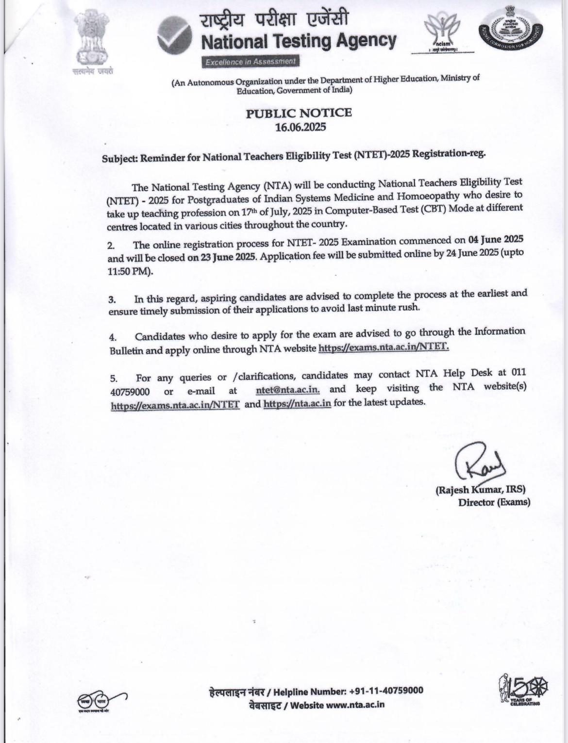 Circular National Testing Agency (NTA) is conducting the National Teachers Eligibility Test (NTET) 2025 registration Download Standard Treatment Guidelines on Management of Metabolic Disorders in Unani System of Medicine Download